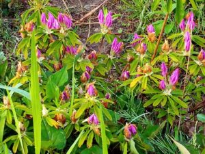 西の山に山藤が見えます。レンズでは赤っぽく見えますが、綺麗な青っぽい紫です。今年は春が遅かったけれど、急激に後れを取り戻していますね。山藤はGWの頃ですよね。