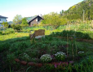 夕方、Kさんのジャガイモ畝が余りにも草茫々なのと、グランドペチカが未だ発芽していなかったので、見に行きました。一番北側は未だ1㎝足らずの芽ですが、南側は確りとした芽が出ていました。その列を草刈りして来ました。
