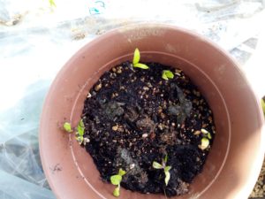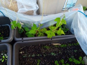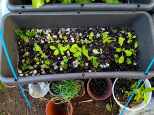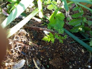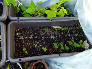 右: 南のプランターで発芽した赤紫蘇とピッコロ人参。