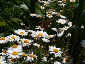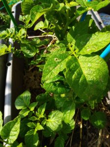 一月前は草も背が低かったですが、草茫々の中でジャガイモ達は頑張っています。先日Aさんがジャガイモの畝とは知らずに仮払い器を掛けてしまったのも結局草で他と見分けがつかなかったためでしょう。一部のジャガイモは草と一緒に刈り取られてしまったかも知れません。少し様子を見ないと無事かどうか分かりません。