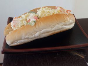 右: 急にサラダパンが食べたくなった。コッペパンを45度の角度で切れ目を入れると零れないんですよ。元気ママキッチンで覚えました。パセリでもあると良かったんだけど。120gを全部詰め込みました。