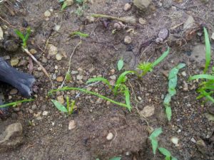 スマホを持たずに行きましたが、西隣さんの野菜達も元気、我が家の実梅も中心に近い枝程、ジベレリン、サイトカイニン等々が働き、太く赤い枝を見せています。根っ子から近い方が先に栄養を貰っていますね。庭の行灯の中の極小苗達も元気でした。薬草ですもんね、この位強くなくっちゃ。