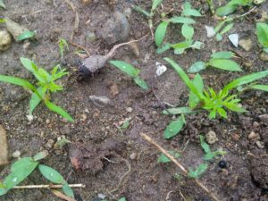 一日も経っていないのにドクダミが葉をひろげていました。鼻声を出してトラ子が何か美味しい物をおねだりに来ました。さっき煮干しも食べちゃったから、無いよ。