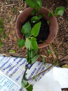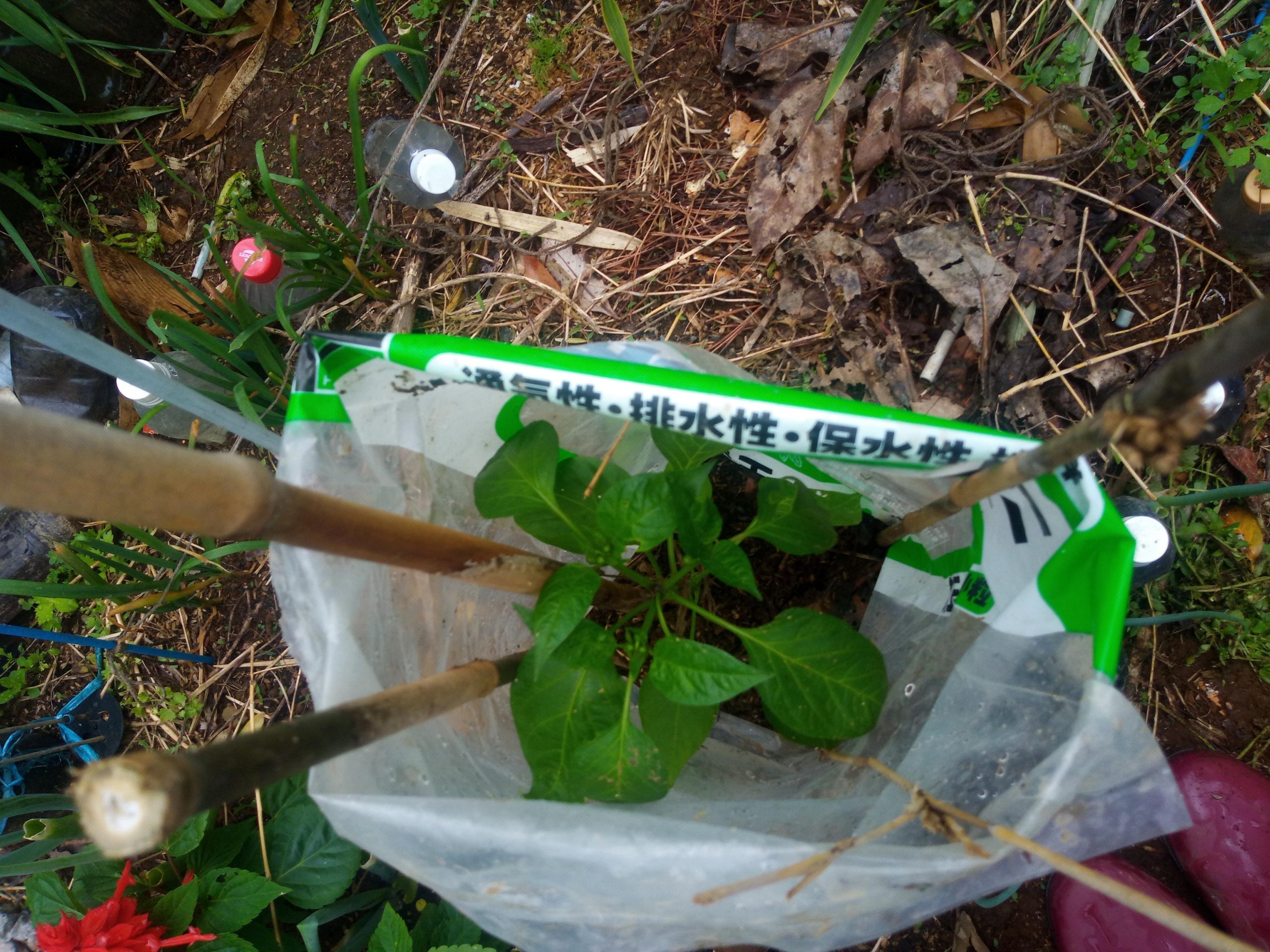 早いから一株だけね。ピーマンを行灯仕立てで植えました。