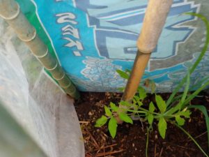 左: 我が家のトマトの行灯の中です。あ、花が着いている。