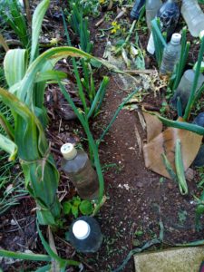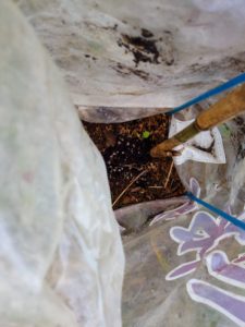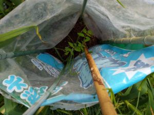 下段右: トマトを寝かせ植えしました。勿論、未だ行灯の中です。