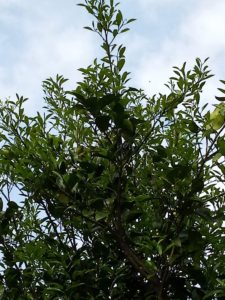 右: 夏蜜柑の東の枝にも古い葉と新葉とがあります。やがて、新旧交代の時期が来ます。