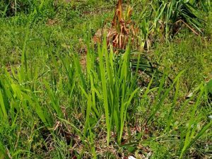 下段: 花壇の円周にあったゴチャゴチャの中からヒオウギアヤメだけを残して、ドクダミやら何やらを切り取りました。