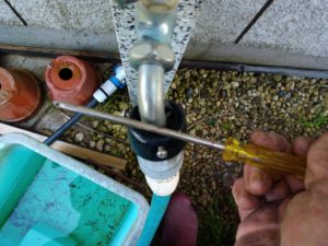 左: 二股ホースを使っていましたが、案外使わなかったなぁ。今年の寒い日に内部に残っていた水でプラが割れましたので、古くて放ってあったホースさんにもうひと頑張りして貰う事にしました。取付工具はプラスの黄色ドライバーですよ~。