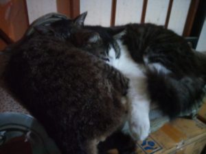 大猫の福が寄り掛かっているので、お尻から崩れ落ちそうなうめは真っ黒にみえます(笑)。しかし、強引な福ちゃんを時々押しやりながら頑張って退かない梅なのです。この後、福がソファを占領したので、私が仲裁に入り、15㎝の空白を作りました。うめは私の意図を理解してソファに戻って来ました。