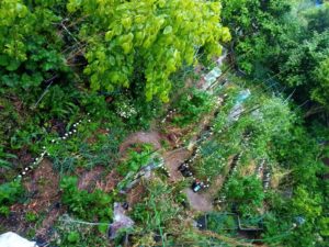 我が家のビオトープならぬ鉄タンニン製造舟が溢れて中央通路に水が流れています。柿も葉を縦にして雨水を流しています。もう沢山!正直な植物の気持ちでしょう。