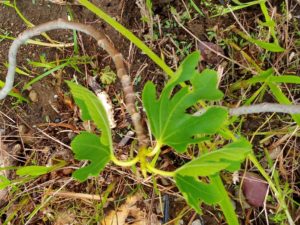 右: 植え替えた無花果は生長点の若葉を落しました。復活なるか!?