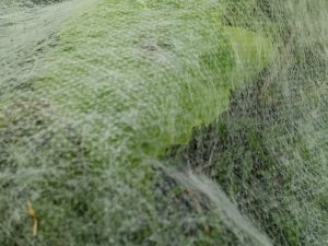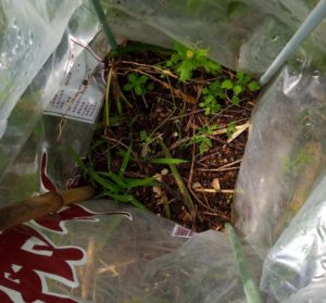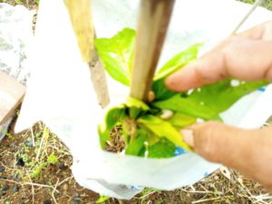左: 南瓜パッチの中で不織布を持ち上げ始めました。