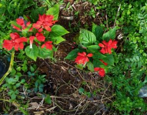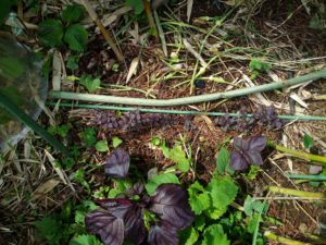 左: 地味だから分からないかなぁ。赤紫蘇が大きくなって来ました。右: 雨除けでビショビショになったペチュニアたち。