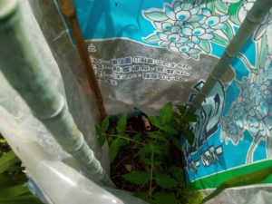 右: 茄子苗が一つ虫に遣られた処へ千両二号の苗を植えました。