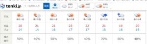 明日16日(月)は未明から雨ですね。17日(火)は曇りで深夜に降り出します。