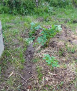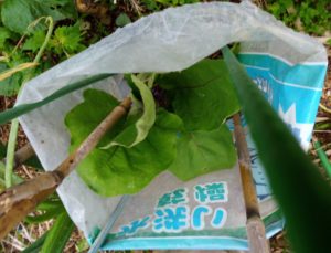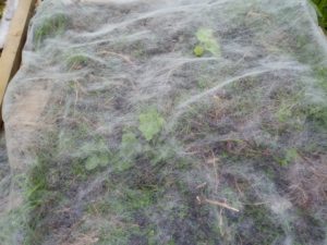 左: 薮枯らしが不織布の下で這いまわっています。後で引っこ抜かなくちゃ!