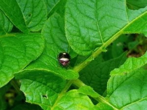 左: 甲虫か幼虫にバリバリ食われたジャガイモ。