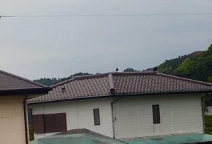 上の写真で3羽烏が屋根に留まっています。オヤッ!?屋根に居なくなった、と思いガラス窓を開けたら、隣の屋根の天辺から見張り烏が飛び立ちました。雨が降ってからも見張り烏だけは天辺で見ていましたが、司令塔からア”~!(馬鹿だねぇ!雨が降ったら私達も収穫出来ないでしょ!?)、と声が掛かり、飛び立って行きました。