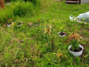 中: 茄子の行灯が4津になりました。虫に喰われかけている幼苗も生かして見る事にし、米茄子くろわしと紫水を行灯に植えました。