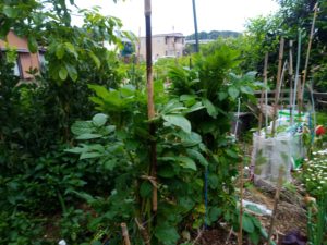 我が家で存在感を増しているのがジャガイモ達です。特にグランドペチカは種が新しいから背が高いです・1-1.2mあります。