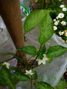 左: 京みどりピーマン。中&右: ピーマンエース…面白いですね、エースは花弁が6枚です。京みどりは7枚?