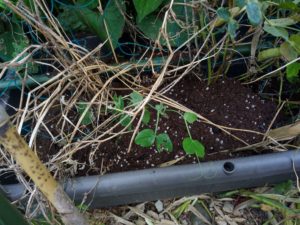 右: 今年はプランターでやって、土量が少なくて旨く行かなかった絹さやですが、胡瓜とゴーヤを其のまま植え付け、土を足したら絹さやに芽が出て来ました。絹さやさん、グリンピースさん、ごめんね(笑)。『そうですよ。土、足らなさすぎ!』