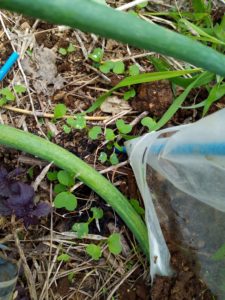 三畝のピーマンの近くに出たアブラナ科です。小松菜や高菜の穂を置きましたから、どれかが発芽してしまったのでしょう。発芽の様子はいつ見ても可愛らしく、元気を呉れるものですね。