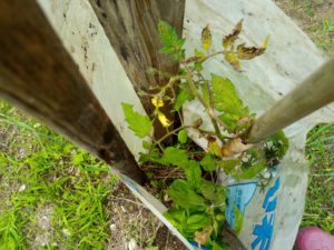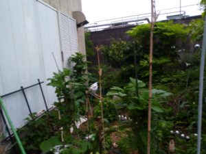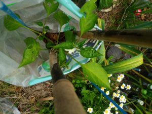 茄子の次に在ったトマトのコンパニオンのバジルは植え直して、トマトとバジルの根っ子を付けました。こうしないと、意味がないし、行灯からバジルがはみ出てしまっていたのです。バジルに花が上がっていましたから摘みました。花を育てると種を付け植物体が妊娠モードに入って葉っぱも硬くなります。常に柔らかくて美味しい葉が出ていないとサラダにも使えません。西隣さんがいらっしゃらない時は私が摘むようにしましょう。そうすれば柔らかい葉が何時でも取れます。