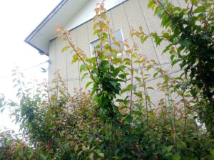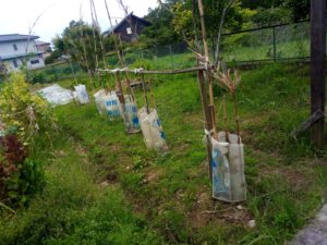 実梅の垂直枝を育てています。梅の木がどの枝を育てたいか、がよく分かります。梅雨前に夏剪定を致します太くて確りした枝を各枝2-3本残す様にします。
