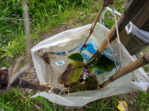 トマトも生長点をもぎられて居たり、オカシイ!多分烏の仕業だと思うけれど、それだけじゃなくて生長の度合いが遅いのは地温が低くて、お嬢さん育ちの苗達がスパルタ教育についていけてないからじゃないかな。GWの時は三枚しか無かったビニール袋が今日はありましたので、遠慮なく使わせて頂きます。