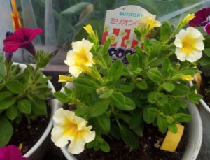ペチュニアの開花。上段左: サフィニアパープル、中: ミリオンベル、右: 小豆フラッペ…美味しそうな名前です~♪下段: ももいろ💛。