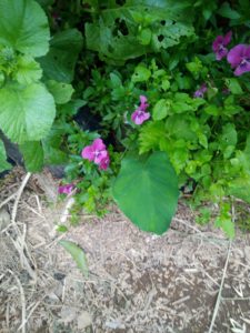 左: ビオラの中から里芋が発芽です。中: カモマイルが咲きそうですね。3株零れ種で出た内の一つ。右: ブラックなビオラ。今年も播種にチャレンジしてみようかな。