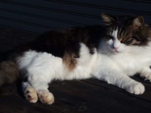 4時起きでした。何があったけ?3時頃タイガーさんが食べていたので、もう一寝入りして彼は帰ったのかな、と思ったら、居た(笑)!タイガーさんの大食漢ぶりはいつもの事だが、一番弱いうめが狙われる。横取りされて表に出て行きました。帰って来て『オカアシャン、お腹が空いた。』、と言うので、新しいお皿を用意していたら、またタイガーさんが奪いに来たから駄目だよ、と私が横に居座った。トラ子は高い処で食べたから、無事。福は床で食べていても反撃をするから無事でした。