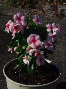 ピンクの花が続きますが、ニチニチソウ先生を鉢増ししました。だから、嵌め殺しの窓には大きくてもう載せられません。緩く縛って今後も垂直仕立て栽培を続けます。本当にこの花をボケーッと冬の間毎日見ている事でホルモンの流れが分かりました。今日からは物干しです。暫くの間夜間は廊下で過ごしてもらいます。梅雨前に一度剪定をして差し穂も作って、じとじととした暑さを乗り切って貰おう。