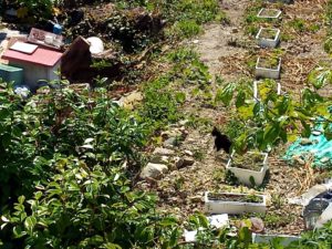 右: 蚕豆収穫後、大根伐採後の庭です。時間が遅いから多分10時半くらいだった? 日の当たり方が朝とは全然違います。