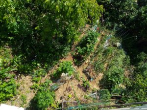 左: これが蚕豆収穫後の姿です。中:レジ袋一杯、撮れました。一番大きなものは22㎝以上ありました。右: こんな風に1m以上の処でこれから膨らむ実もありましたが、早い処空気の流れを確保したいので、残念ですが、処分しました。来年、こうした実を充実させるやり方を見つける事が課題になりました。尤も来年は種類を掛けて2-3種類作ります。今年休んだ大天、と何かを見つけましょう。