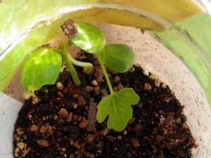 左: 一月位前にwinter-sowing ボトルに入れたマダーボウルの種。動きが無いから諦めていた。片づけようとふと覗いたら2本芽が出ていました(笑)。お隣の小父ちゃんとチャレンジする事にしました。お隣では既に紅花インゲンに花が着いています。家は未だ…。