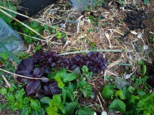 右: 二畝の延長と言うか、庭の入り口にある三角形の畝です。赤紫蘇が目いっぱいの太陽光線を浴びて育っています。赤紫蘇は太陽を浴びないと赤が綺麗に出ないです。