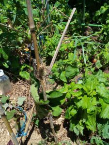 左: 先日挿し穂を挿した四畝北です。葉がシャキッとたっているので、支柱を立てる事にしました。