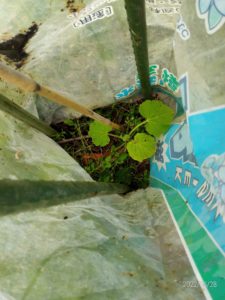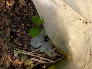 中: もう一つの堆肥枠の上の南瓜も行灯にしました。植えてから最近まで露地育ちの南瓜は最近苗帽子を掛けてから葉の数が増えました。やはり、寒かったんだね。ごめんねぇ!