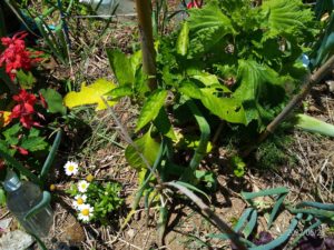 紫蘇の葉の奥にも、マリゴールドの鉢の傍の草の中にも実は南瓜が隠れています。