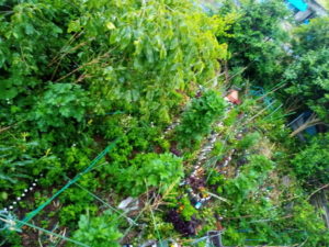 里芋の葉は育てている者に元気をくれる勢いに溢れています。緑も健全な状態を示しています。元肥として近くに生ごみをちょうど半年寝かしてあります。