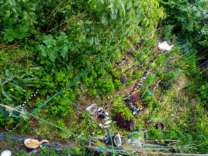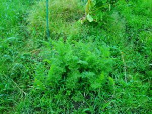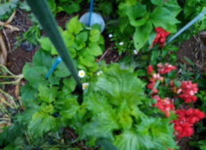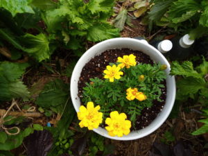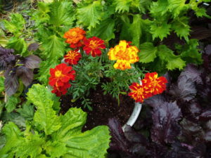 青紫蘇、赤紫蘇の中でマリーゴールドがのびのび育っています。