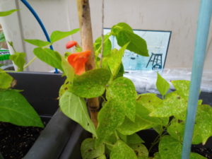 右: 初めて咲いた紅花インゲンの花。