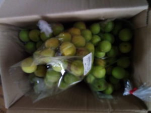 左: 1㎏の梅x5袋はポリ袋の口だけ切っていますが、今日は平たい箱に開けてあげよう。