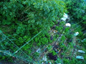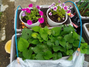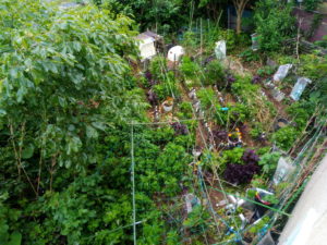 庭の東北東にある南瓜たちと庭全景。今日は0-1畝間の通路の土を雨前に0畝に上げて置きます。(完了!)野菜生ごみは昨日置いてしまったけれど、これは上に上げません。上げると畝がダンゴムシだらけになります。もっと分解してからですね。