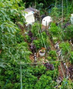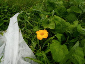 庭の東北東にある南瓜たちと庭全景。今日は0-1畝間の通路の土を雨前に0畝に上げて置きます。(完了!)野菜生ごみは昨日置いてしまったけれど、これは上に上げません。上げると畝がダンゴムシだらけになります。もっと分解してからですね。