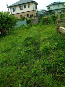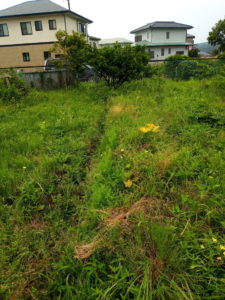 西隣さんの人参の後ろのグレー支柱は家で余った大きな生姜(竜馬生姜)を植えましたが、その横にMさんから頂いた種生姜を五か所に植えました。家は狭いので植えるところがもうない。穴を掘って植え、刈草を被せてあります。間違えて刈り取らないでください。