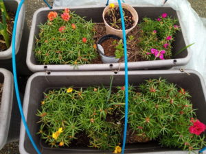 左: ポーチュラカのプランターの土が段々見えなくなってきました。